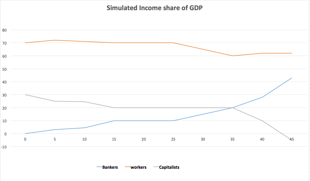 Inequality has been often defined as a struggle between the capitalists and the working class. This description is greatly attributed to Marx’s views on capitalism, “a society composed of two groups that have opposing interests and whose relationship is exploitative.” However, due to the steady fall of worker share on GDP, inequality is “quickly becoming a problem between the financial industry and the rest of the world, and the bad news is that finance is wining” (S. Keen). The graph above shows what happens to a relative stable capitalist system when the workers share of GDP begins to fall below certain levels. Once the workers share reaches their lowest point, the ratio of GDP share for the financial industry begins to raise exponentially, while the income for both capital owners and workers begins to fall exponentially at an equivalent rate.