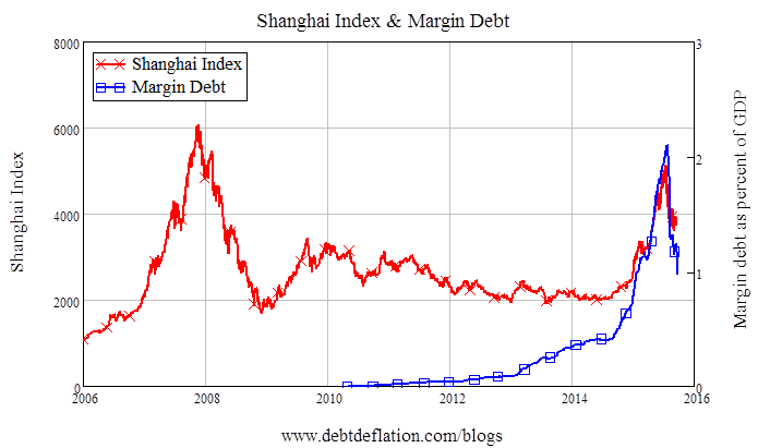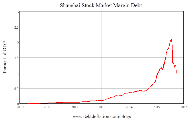 One thing my 28 years as a card-carrying economist have taught me is that conventional economic theory is the best guide to what is likely to happen in the economy. Read whatever it advises or predicts, and then advise or expect the opposite. You (almost) can’t go wrong. Nowhere is this more obvious than in its strident assurances that the value of shares is unaffected by the level of debt taken on, either by the firms themselves or by the speculators who have purchased them. This theory, known as the “Modigliani-Miller theorem”, asserted that since a debt-free company could be purchased by a highly levered speculator, or a debt-laden company could be purchased by a debt-free speculator, therefore (under the usual host of Neoclassical “simplifying assumptions”, which are better described as fantasies) the level of leverage of neither firm nor speculator had any impact on a firm’s value—and hence its share price. The sole determinant of the share price, it argued, was the rationally discounted value of the firm’s expected future cash flows. Armed with that theorem, I was always confident of the contrary assertion: that debt played a crucial role in determining stock prices. So, like the fictional 19th century French detective who began every investigation with the cry “Cherchez La Femme!”, my first port of call in understanding any stock market bubble is “Cherchez La Debt!”. It took a while to locate Shanghai’s margin debt data (the easier to find stock index data is here), but once I plotted it, the reliability of my trusty old contrarian indicator was obvious. While these figures may well substantially understate the actual level of margin debt [see also here], they imply that, starting at the truly negligible level of 0.000014% of China’s GDP in early 2010, margin debt rose to over 2% of China’s GDP at its peak in June of this year. It has since plunged to just under 1% of GDP—see Figure 1. Figure 1: Margin debt as a percent of China’s GDP: from 0.000014% to 2% in 5 years–and back down again image002 The ups and downs of margin debt have both paralleled and driven the stock market boom and bust in China: as the leverage of speculators rose and fell, so did the market—see Figure 2. Figure 2: A debt bubble begets a stock market bubble image004 This isn’t just correlation. As I explained briefly here, demand in our economies is the sum of demand from the turnover of existing money, plus demand from newly created money—which overwhelmingly comes from bank lending. This demand is then spend on both goods and services, and assets—property and shares. Since leverage forms a large part of the demand for property (via mortgages) and shares (via margin debt, and the leverage used by professional stock market firms to amplify relatively small gains from high frequency trading and the like), the flow of demand into these markets is largely determined by the change in the relevant type of debt. The flow of supply is the flow of existing or new assets being placed onto the market for sale, and is much less volatile than demand. If the two flows are roughly equal, then the price index will remain constant. There is thus a causal link between the rate of change of margin debt and the level of stock prices (and ditto a link between the rate of change of mortgage debt and the level of house prices). This implies a causal link between the acceleration of margin debt and the change in stock prices—which is borne out for China by Figure 3. Figure 3: The correlation between margin debt acceleration & monthly change in the Shanghai index is 0.69 since 2014 & 0.87 since 2015 image006 Just as the Chinese private sector dived into debt far faster than America or Japan, Chinese speculators have dived into margin debt far faster than their Yankee counterparts. It took America 9 years to go from margin debt being 0.5% of GDP to 2%; China made that transition in about 10 months (see Figure 4). They are piling out just as quickly, and the end of that process is nowhere near in sight. Figure 4: Chinese margin debt has risen much faster than the USA’s