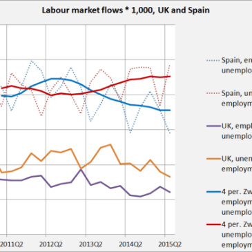 Net employment has been increasing at a brisk pace in the UK and, since the third quarter of 2013, in Spain. Eurostat (kudo’s) has new data about this: labour market flows. This statistic shows how many employed people became unemployed, how many unemployed people became employed, how many ‘inactive’ people became ‘active'(i.e. became employed or started looking for a job) and how many ‘active’ people became ‘inactive’.